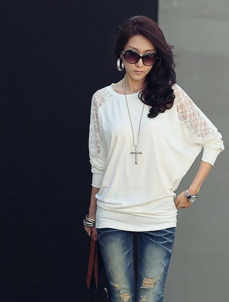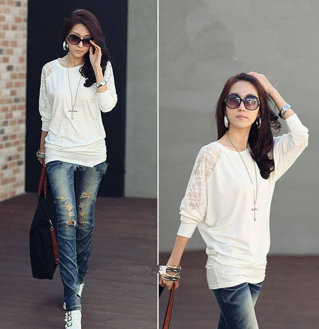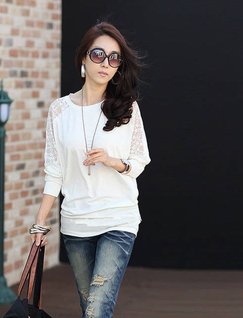 Lady Fashion Lace Patchwork Long Sleeve Round Neck Blouses