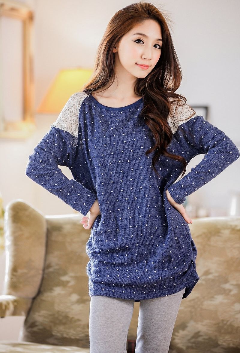 Winter Fashion Lace Patchwork Round Neck Knitted Long Pullovers