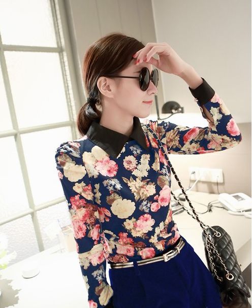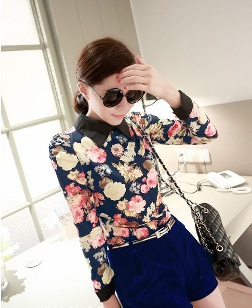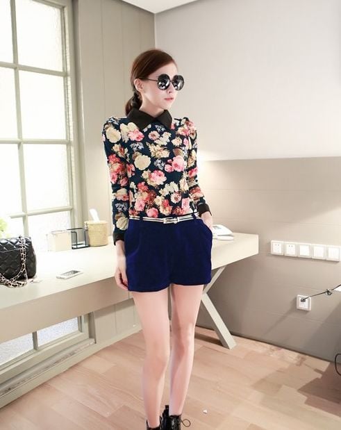 European Style Flower Lapel Faux Two Pieces Long Sleeve Blouses