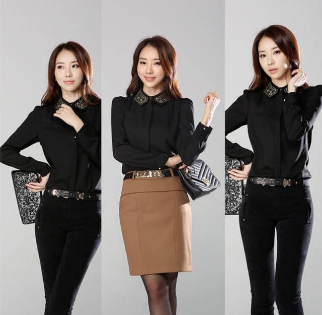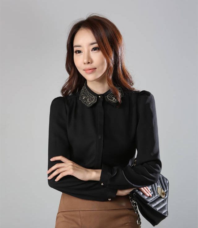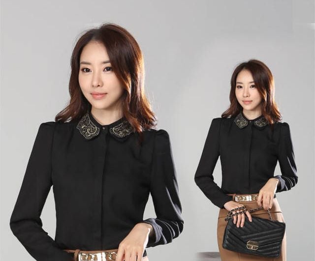 Office Lady Embroidery Lapel Long Sleeve Chiffon Blouses