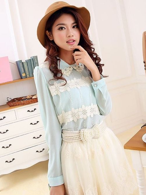 Korean Sweet Style Pure Color Lace Embroidery Lapel Blouse