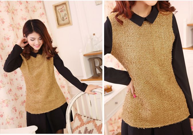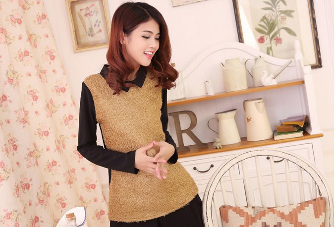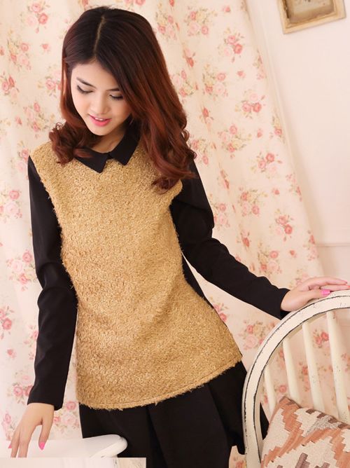 New Arrival Lapel Woolen Color Block Back Zip Blouse
