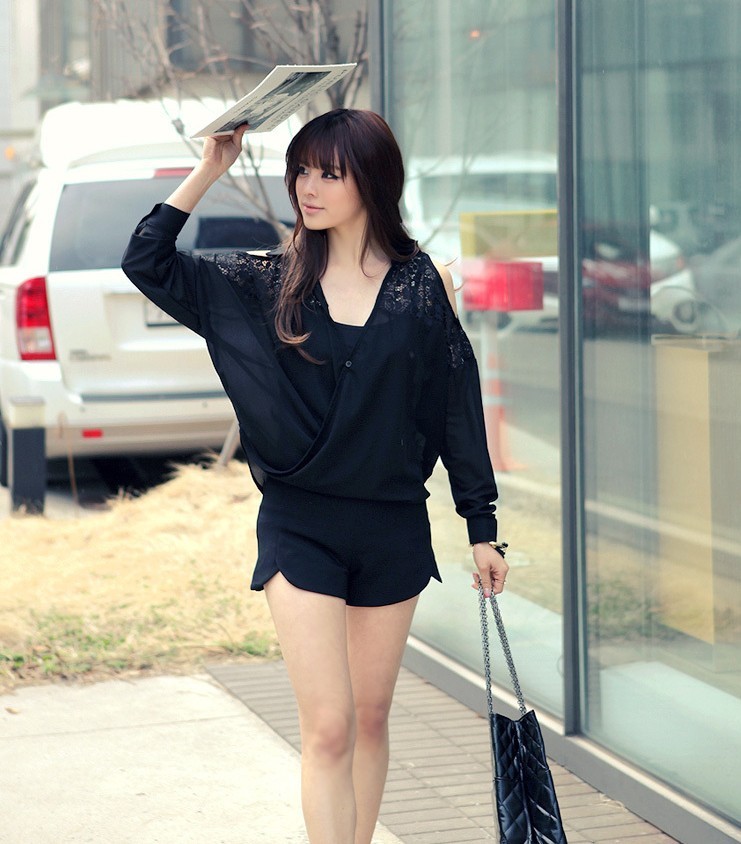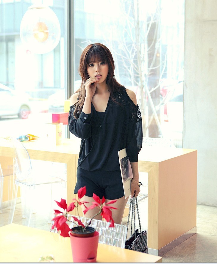 Pure Color Lace Embossing Off Shoulder V-Neck Blouse