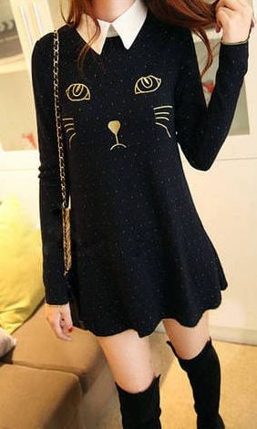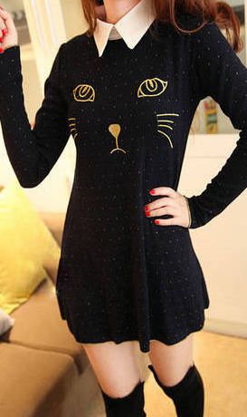 Fall Fashion Cat Embroidery Long Sleeve Lapel Dress