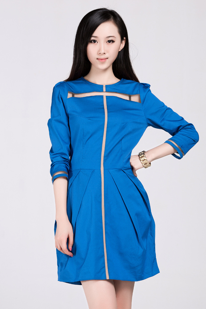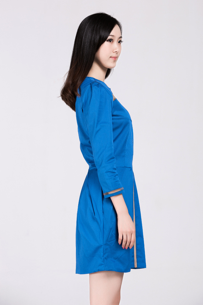 New Arrival Pure Color Round Collar Gauze Splice Blue Dress