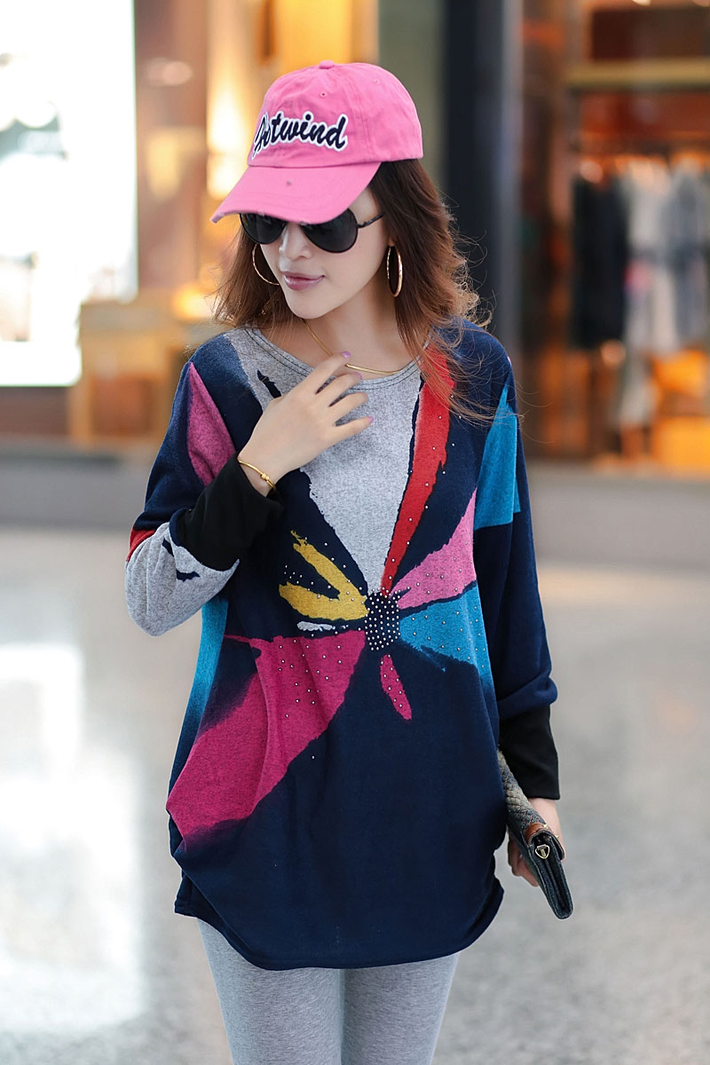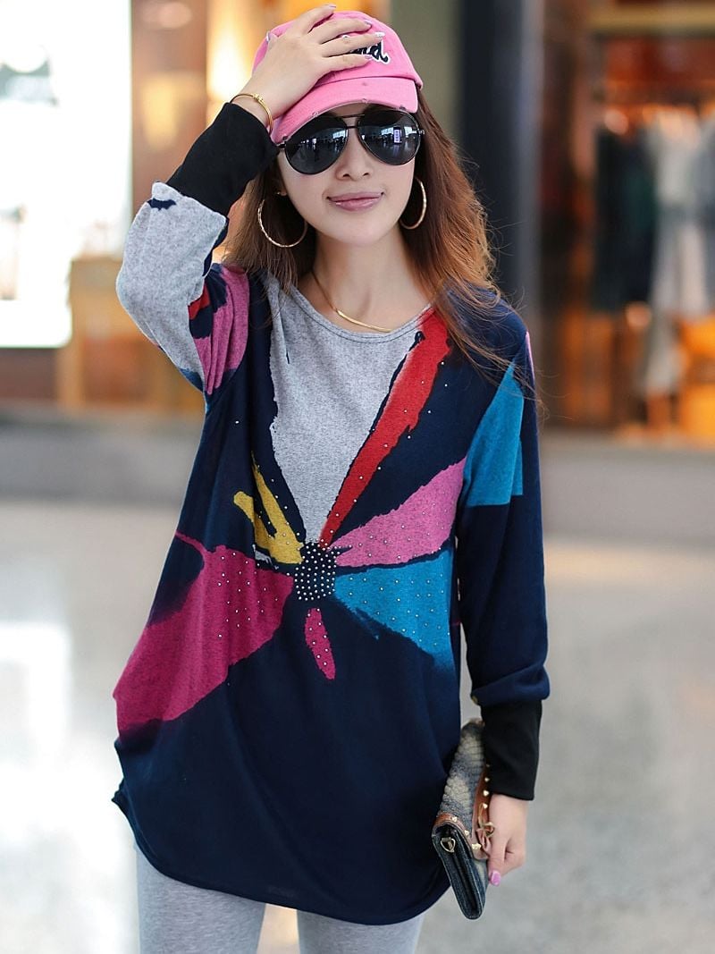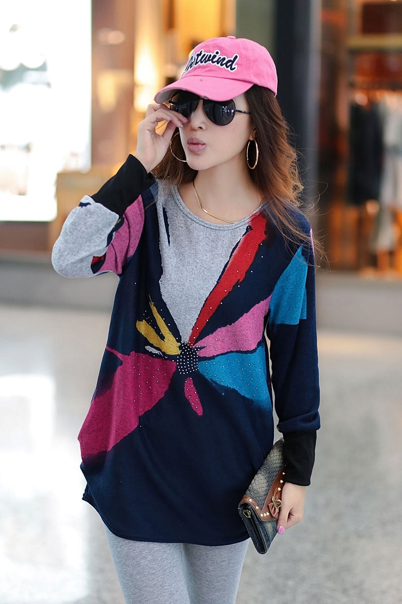Fall Fashion Colorful Printing Hot Drilling Round Neck Long T-Shirts