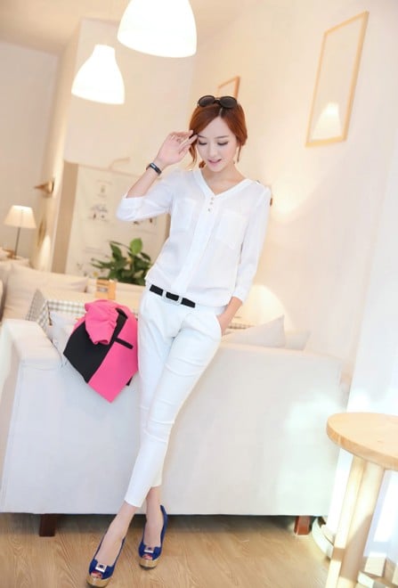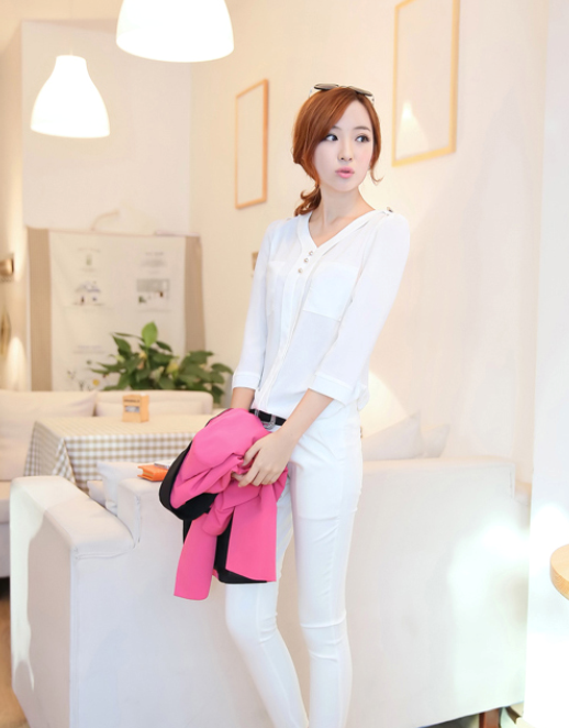 Fresh Summer V Neck Three-quarter Sleeve Hemp Blouse