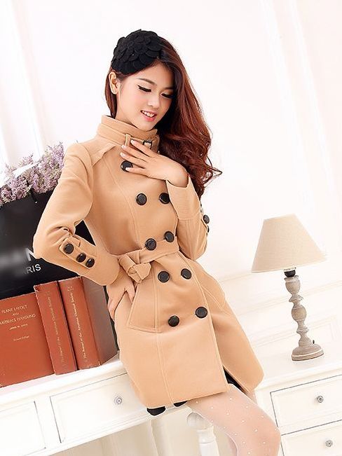 European Style Double Breasted Pure Color Slim Fit Long Coat