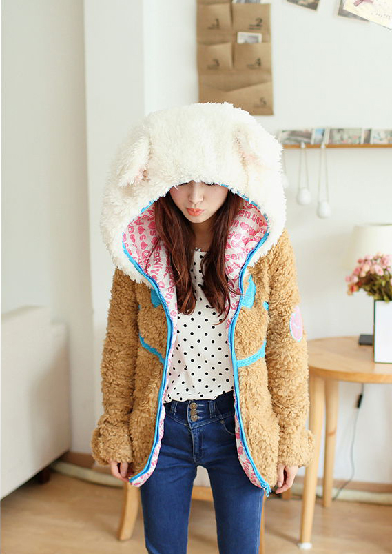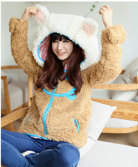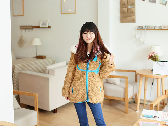 Korean Cute Style Fluffy Color Block Round Large Hat With Gloves Smile Coat