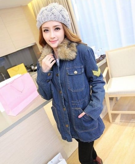 New Winter Fur Collar Lambswool Lined Denim Coat