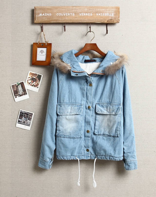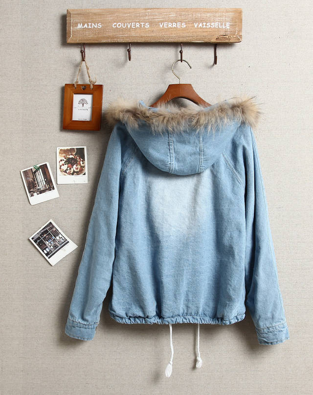 Young Fashion Lambs Wool Hooded Pulling Ropes Short Denim Jacket