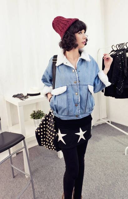 Eye-Catching Lambs Wool Patchwork Lapel Button Pocket Short Denim Jacket