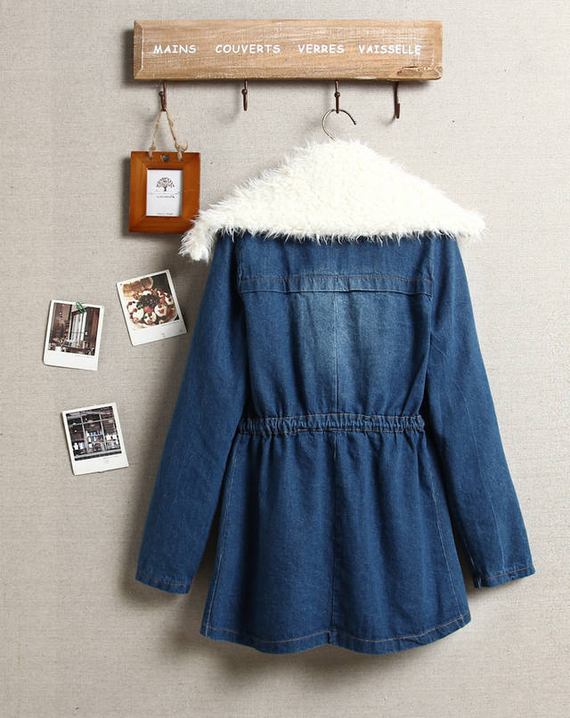 Lady Fashion Lapel Pockets Pulling Ropes Long Denim Jacket