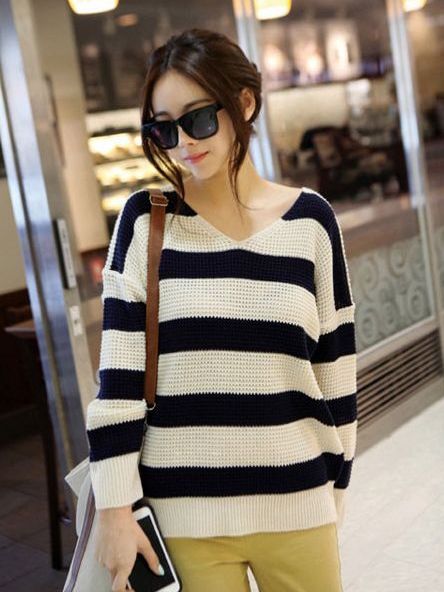 New Arrival Stripes Knitting V-Collar Casual Style Sweater