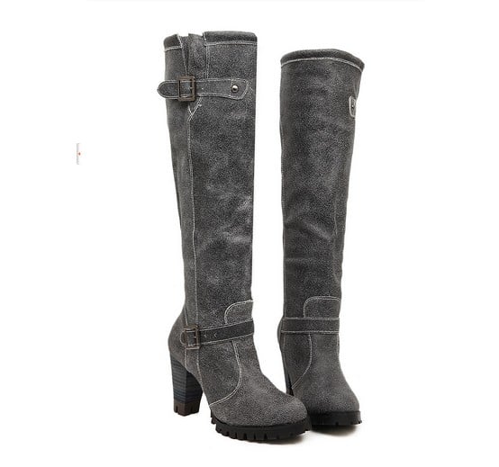Retro Style Leather Metal Buckle Chunky Heel Long Boots