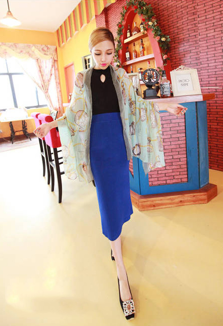 New Arrival Pure Color Knitting Open Side Hem Blue Skirt